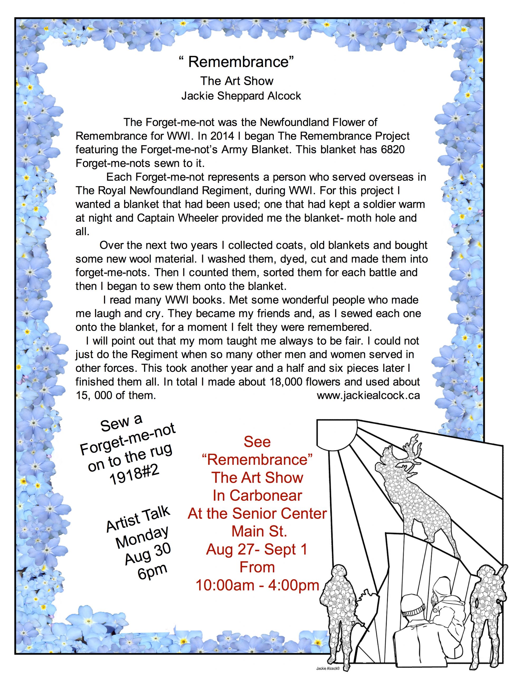 “Remembrance” Exhibit by Jackie Alcock Saturday, August 28 to Monday, August 30th 10 a.m. to 4 p.m. at 163 Water Street August 27, 2021 Stop by 163 Water Street over the next few days to see the artist exhibit “Remembrance” by Jackie Alcock.