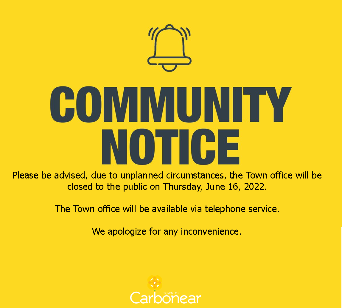 Please be advised, due to unplanned circumstances, the Town office will be closed to the public on Thursday, June 16, 2022.