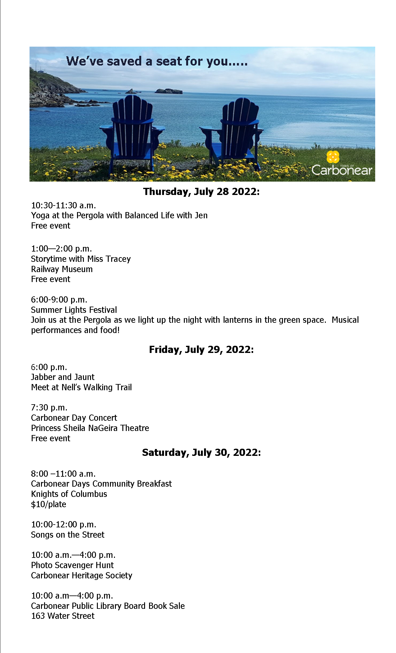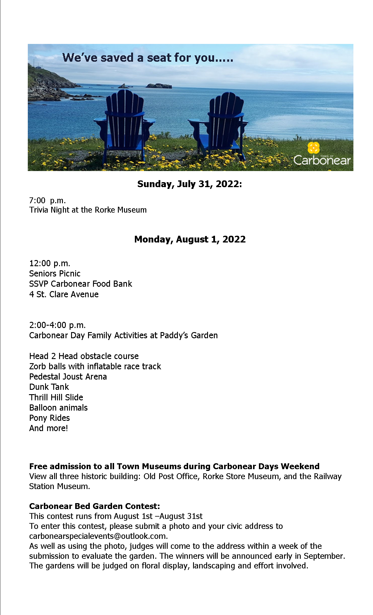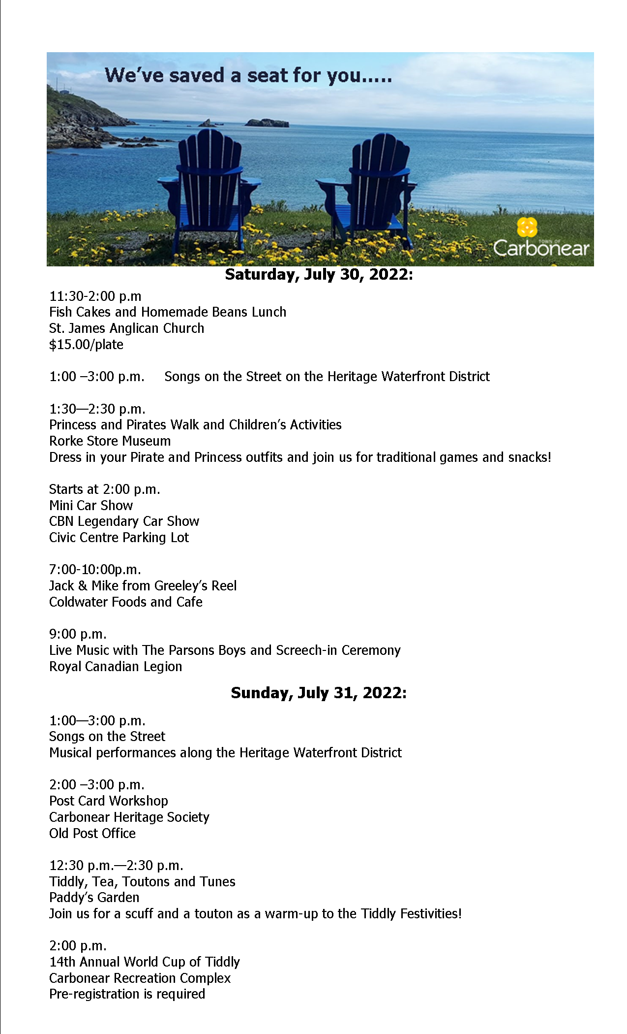 Updated Schedule of events for Carbonear Days!