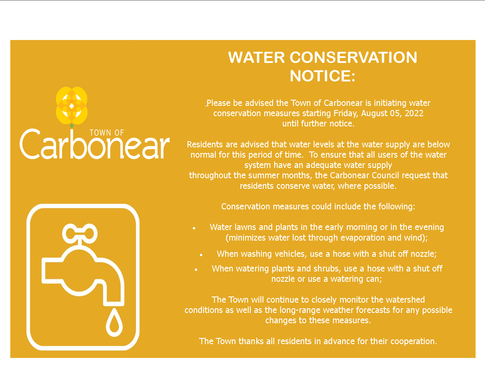 Please be advised the Town of Carbonear is initiating water conservation measures starting Friday, August 05, 2022 until further notice.