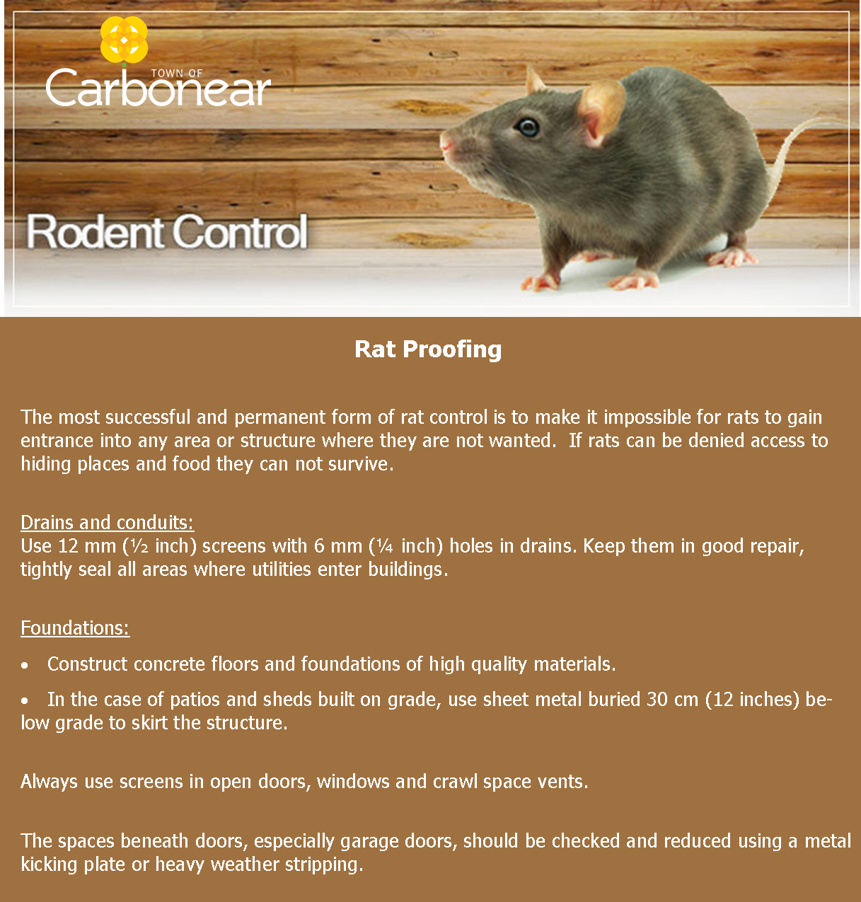 Whether you own property or rent, live or work in the Town of Carbonear, everyone has a role in rat prevention. Rat proofing your home and property is the most important factor to prevent and control these pests.