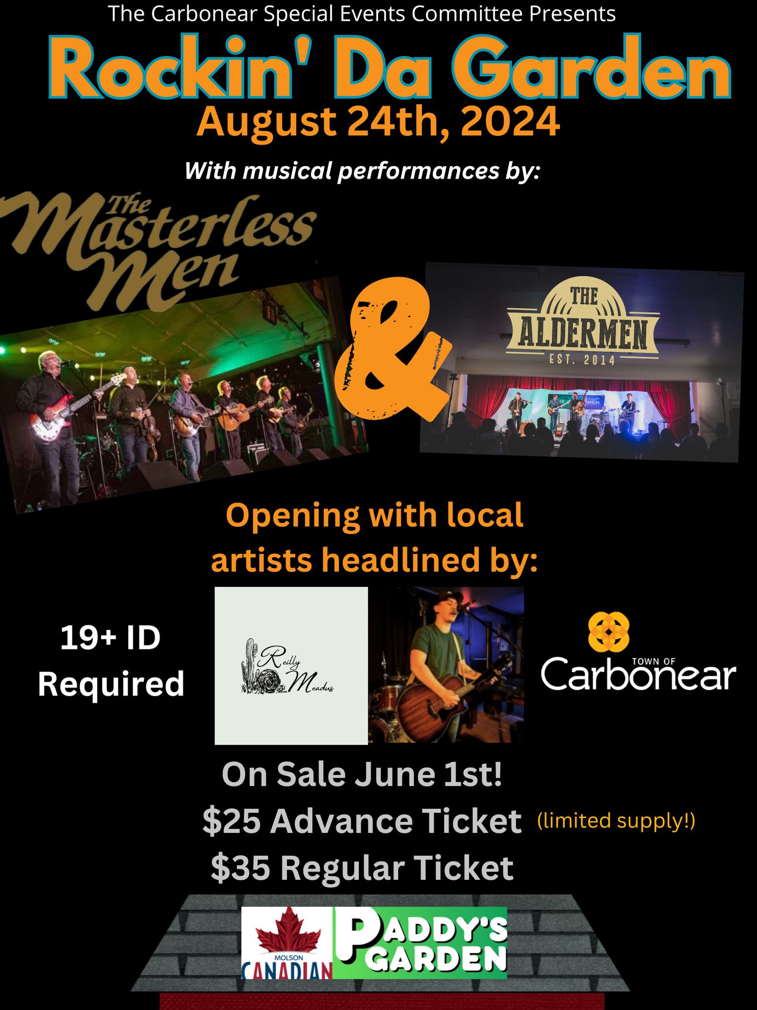 CARBONEAR CONCERT ANNOUNCEMENT: This year we’re “Rockin’ Da Garden” again at Paddy’s Garden on August 24th with musical performances by Masterless Men, The Aldermen, and Local Artists headlined by Reilly Meadus!