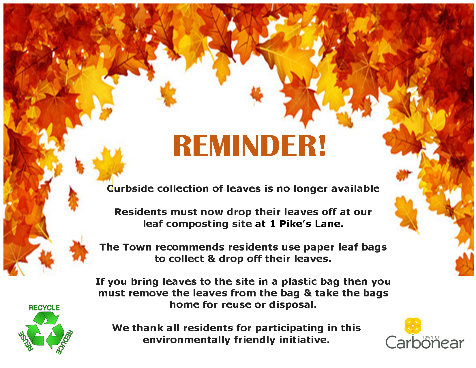 REMINDER: Residents can drop off leaves to the leaf composting site at 1 Pike’s Lane