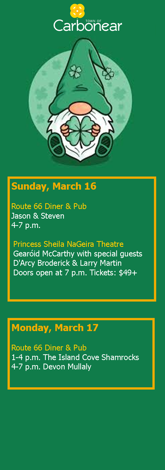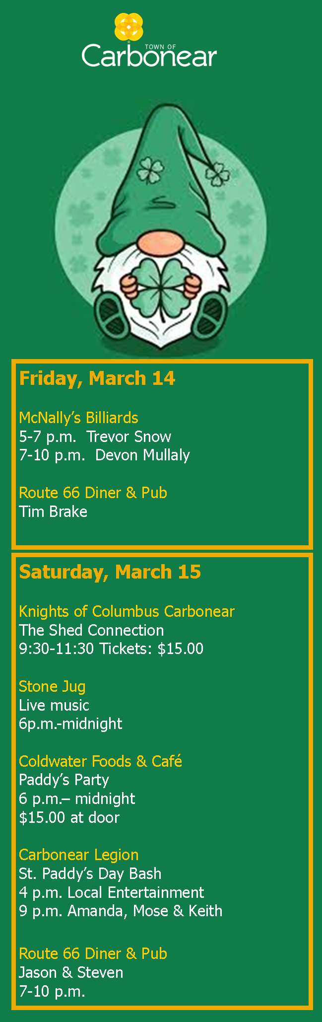 St Patrick’s Day weekend in Carbonear! Lots to see, do, hear, and taste in Carbonear this weekend! March 14, 2025