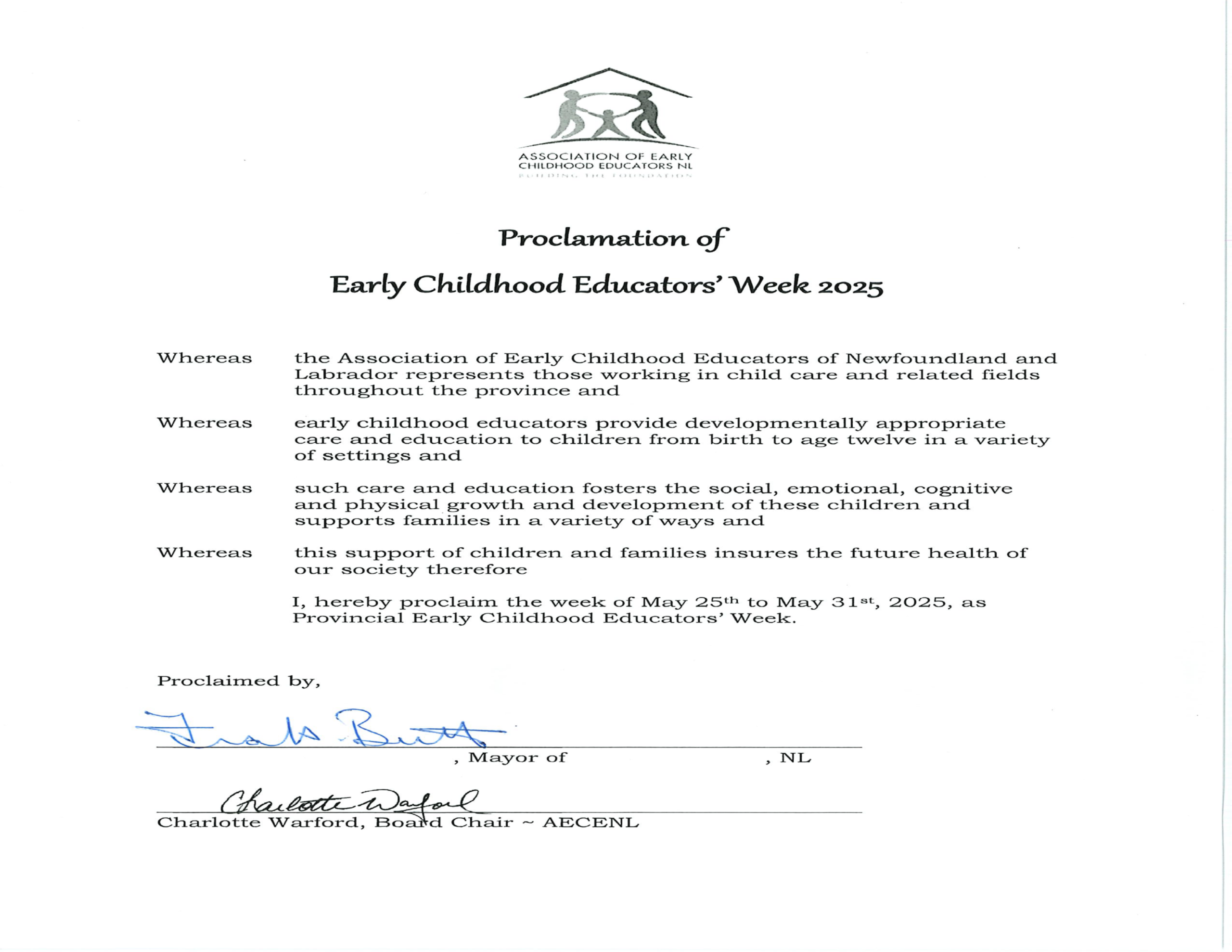The Town of Carbonear proclaimed this week as Early Childhood Educators Week in our Regular Council Meeting on Tuesday, May 13, 2025.