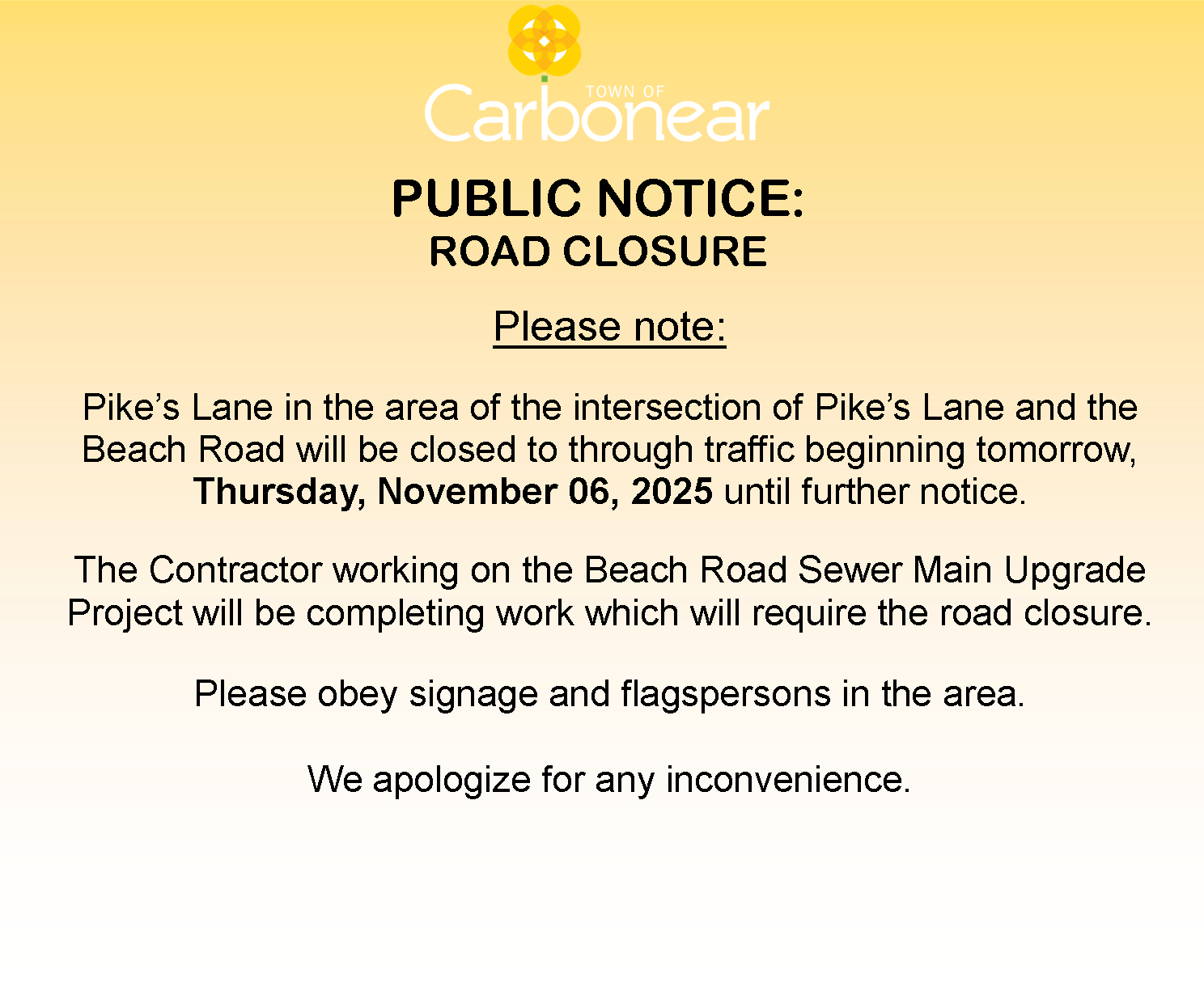 Pike’s Lane in the area of the intersection of Pike’s Lane and the Beach Road will be closed to through traffic beginning tomorrow, Thursday, November 06, 2025 until further notice.