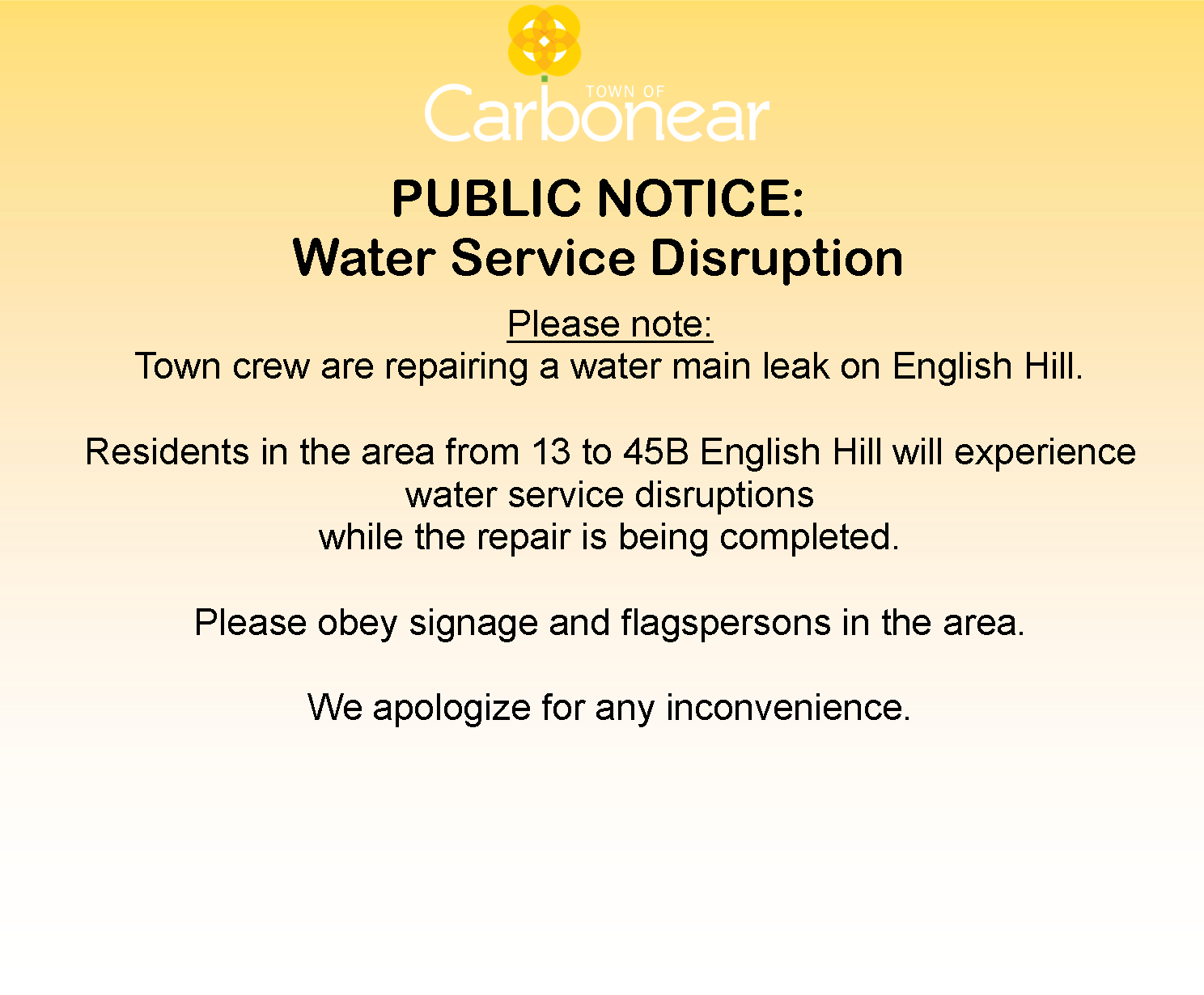 NOTICE: Town crew are repairing a water main leak on English Hill. Residents in the area from 13 to 45B English Hill will experience water service disruptions