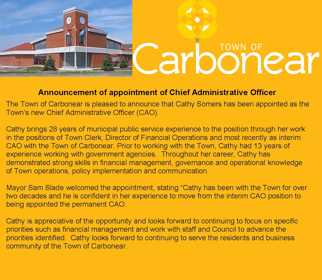 The Town of Carbonear is pleased to announce that Cathy Somers has been appointed as the Town’s new Chief Administrative Officer (CAO).