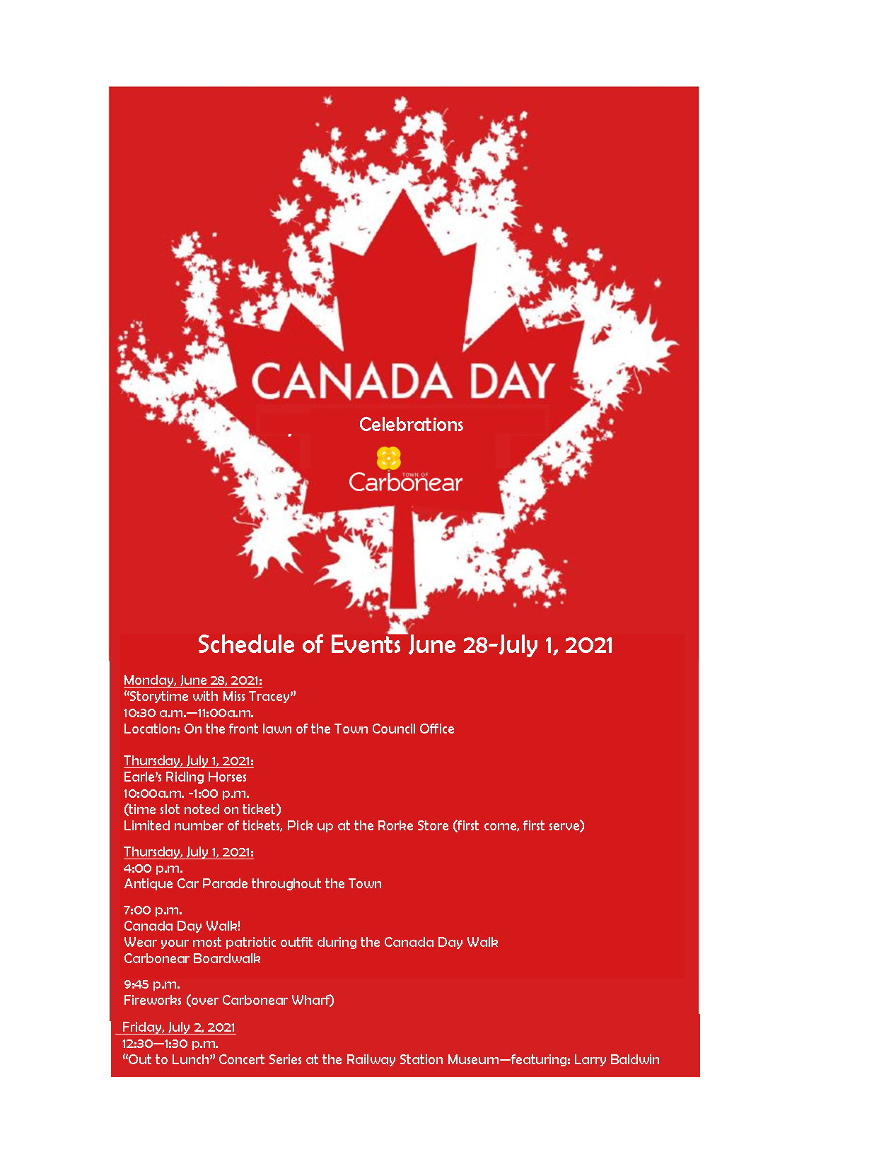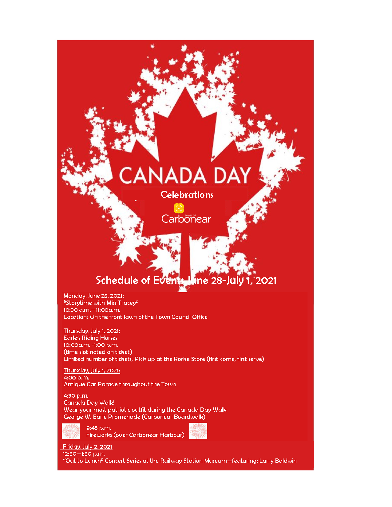 Town of Carbonear hosted events and festivals take place at various times throughout the year and may include Carbonear Day, Canada Day celebrations, Winter Carnival, and others as required.