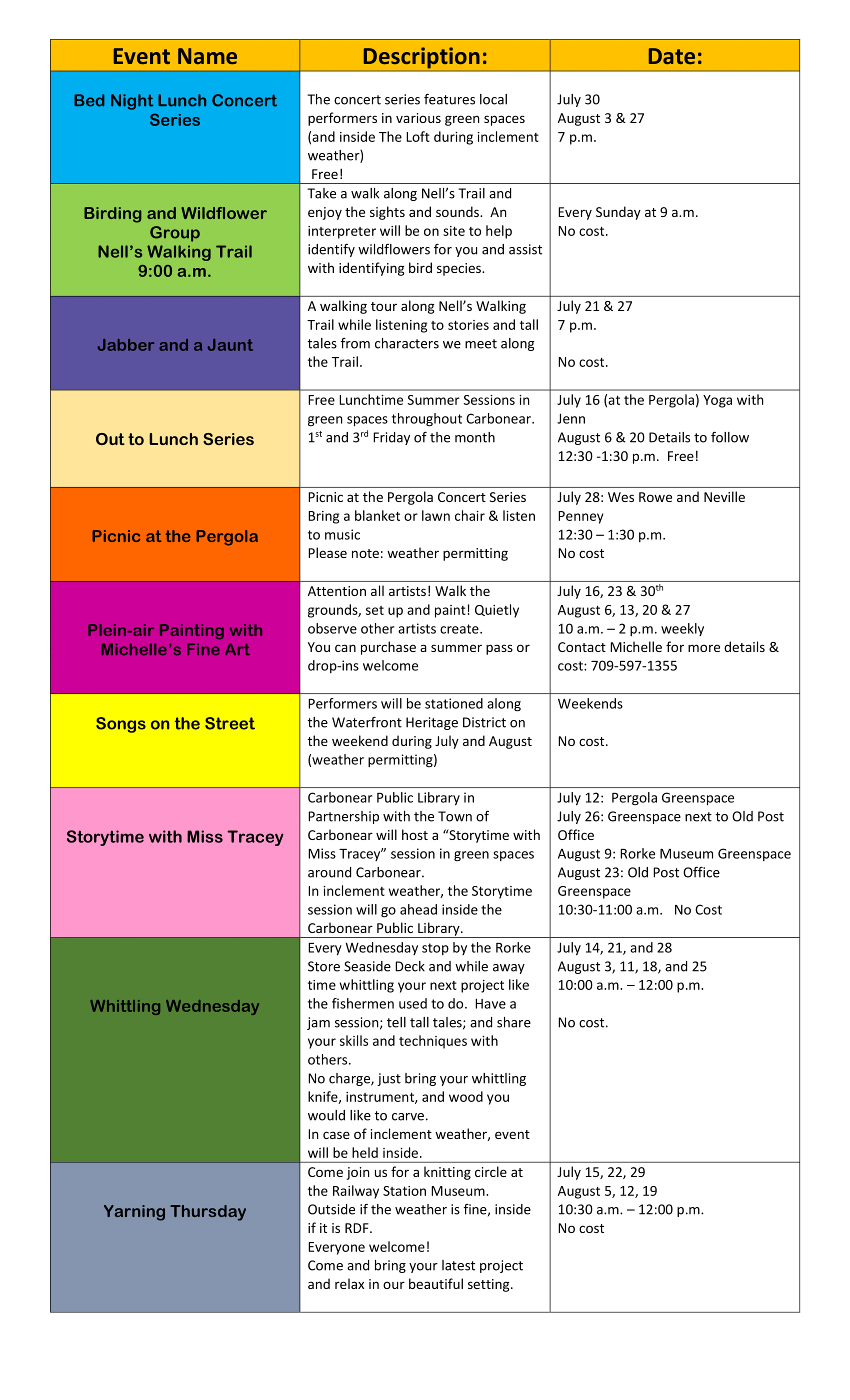 Performances will feature a schedule of locations that incorporate heritage locations and town facilities/green spaces. The first Tuesday will be Youth specific, featuring youth performers solely.