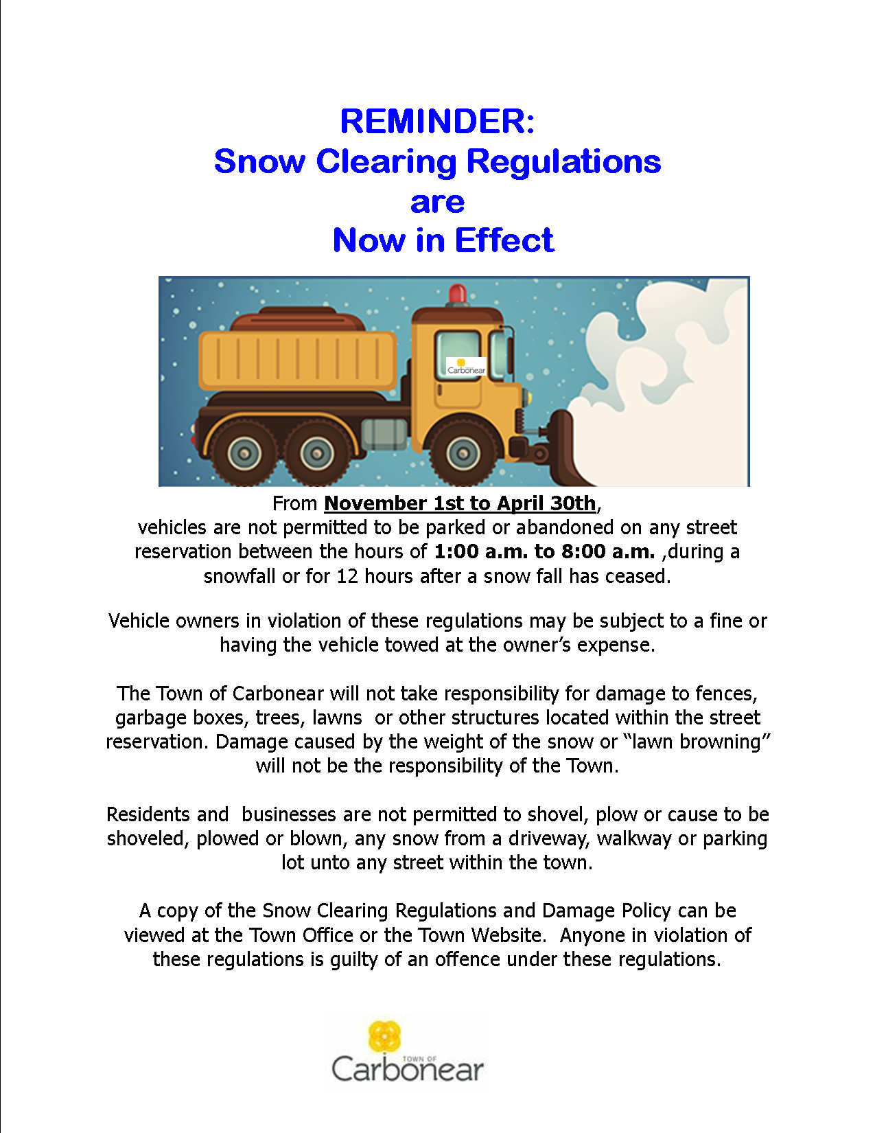 The Town of Carbonear will not take responsibility for damage to fences, garbage boxes, trees, lawns or other structures located within the street reservation. Damage caused by the weight of the snow or “lawn browning” will not be the responsibility of the Town. Residents and businesses are not permitted to shovel, plow or cause to be shoveled, plowed or blown, any snow from a driveway, walkway or parking lot unto any street within the town.