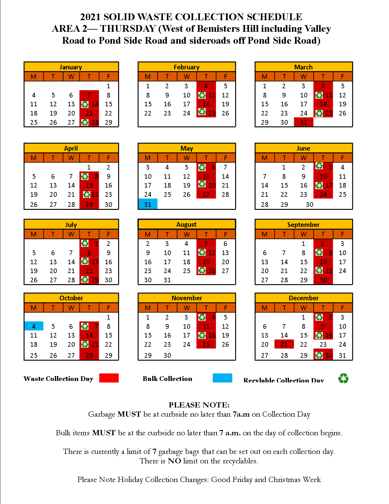 Garbage which would normally be collected on Friday, December 25, 2020 will be collected Wednesday, December 23, 2020.