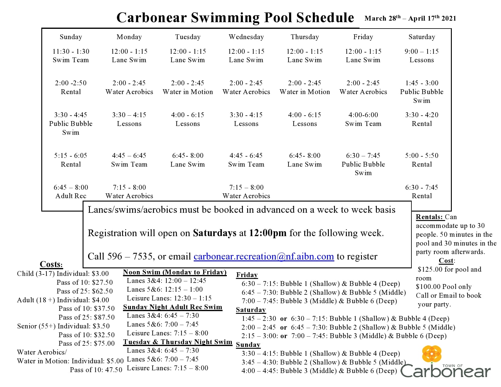 Bookings for next week (Sunday March 28th – April 3rd) can be made by calling the pool at 596-7535 or emailing [email protected] on Saturday (march 27th) between 12:00PM-3:30PM