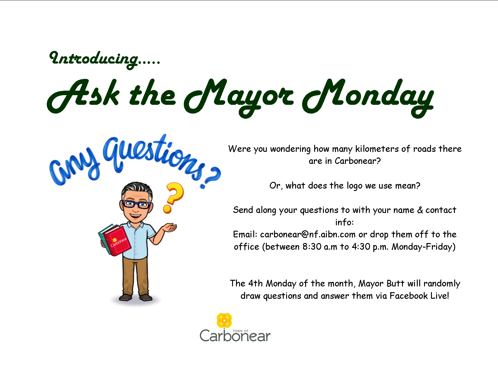 Mayor Frank Butt 596-3831 Ext 226 (Town Office) or frankbutt@nf.aibn.com