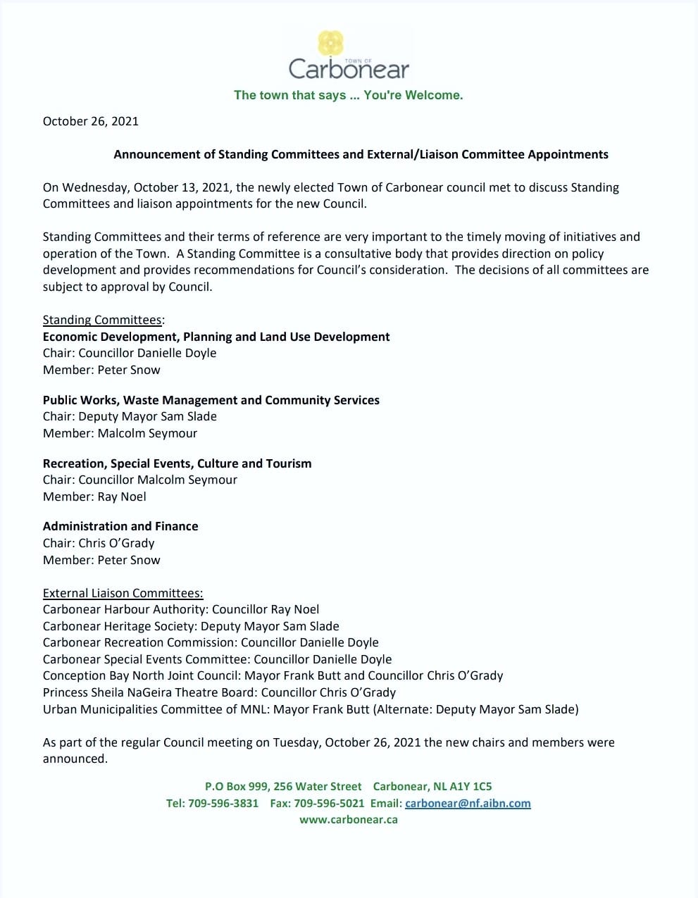 Finance Chair, Councillor Chris O’Grady 596-3831 (Town Office) or chrisogrady@nf.aibn.com
