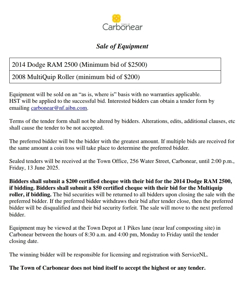 Sealed tenders will be received at the Town Office, 256 Water Street, Carbonear, until 2:00 p.m., Friday, 13 June 2025.
