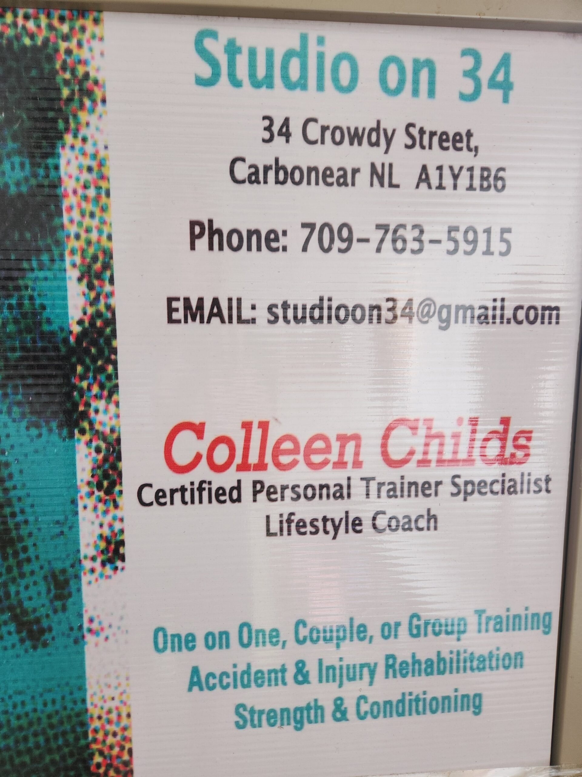 Studio on 34, located at 34 Crowdy Street, is owned and operated by Colleen Childs. Colleen offers a fitness studio and life coach services and has been in business for 12 years in the Town of Carbonear.