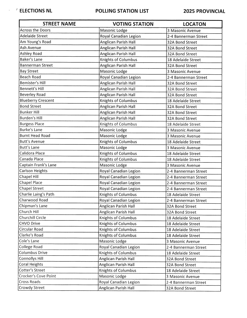 2025 Provincial Polling Station List for Carbonear