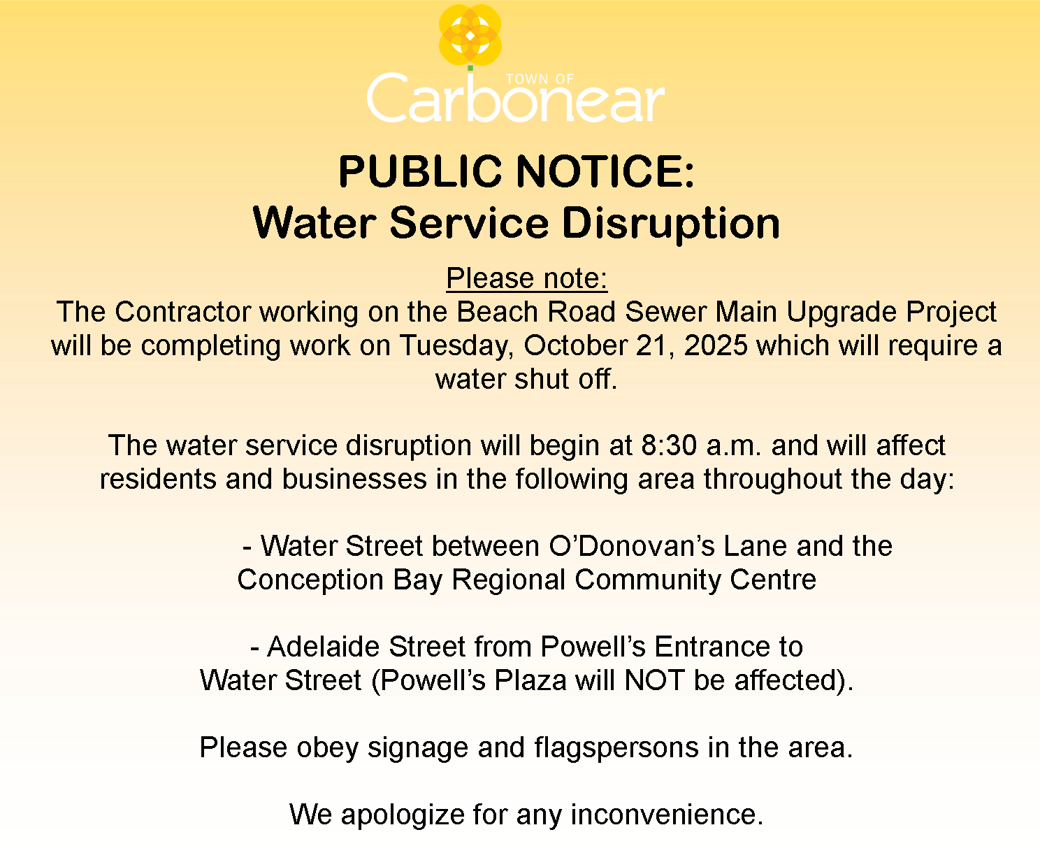 Planned Water Shut Off for tomorrow Tuesday, October 21, 2025 affecting residents on Water Street from O’Donovans to Conception Bay Regional Community Centre