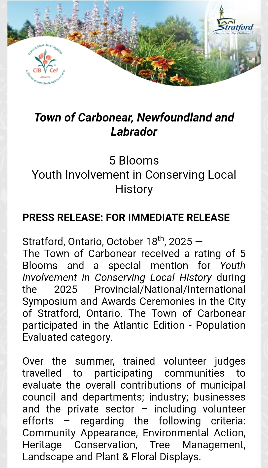 The Town of Carbonear Regular Council Meeting will take place Wednesday, October 15, 2025 at 5:30 p.m.