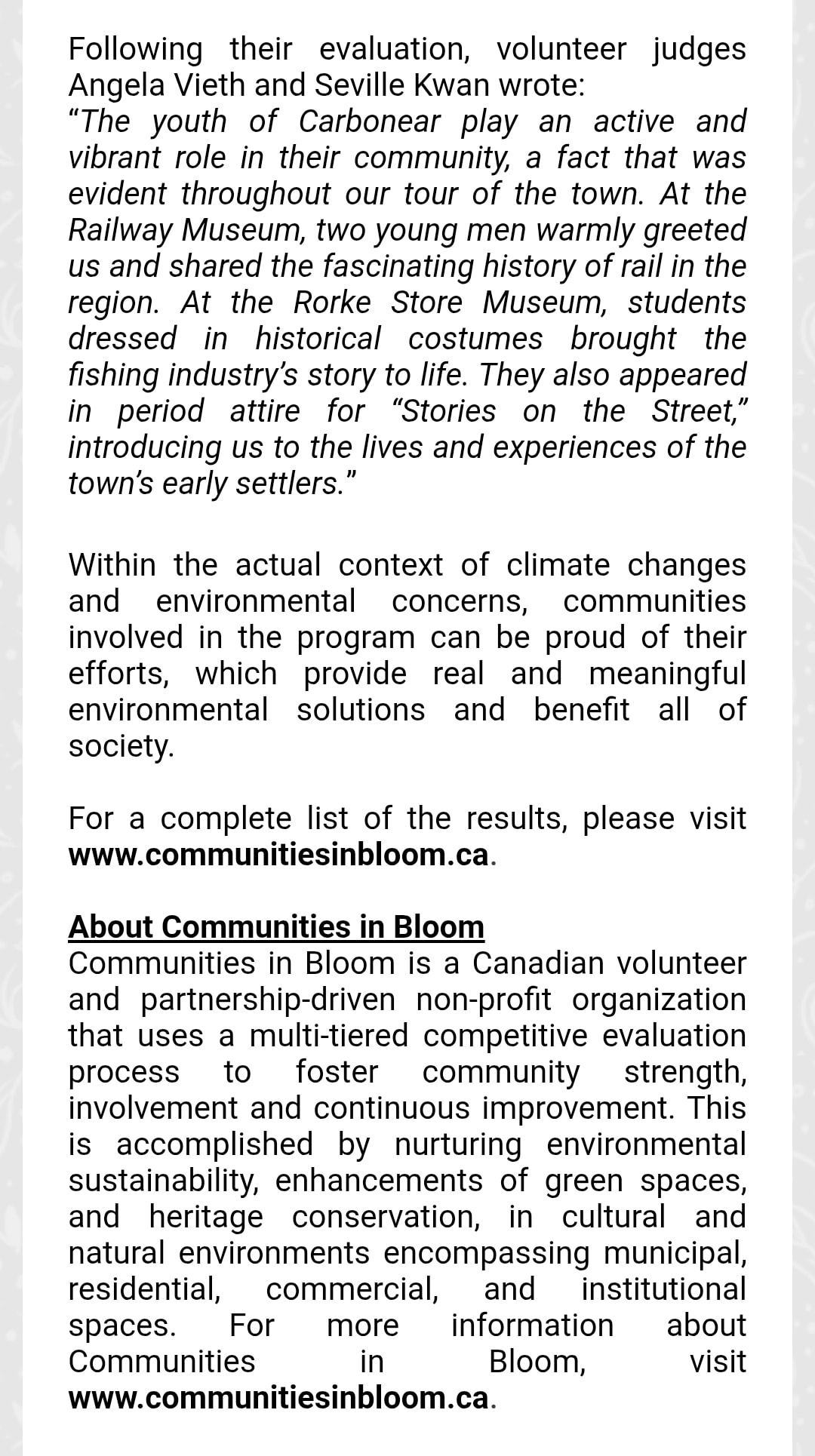 Communities in Bloom Press Release – 5 Blooms and Youth Involvement in Conserving Local History