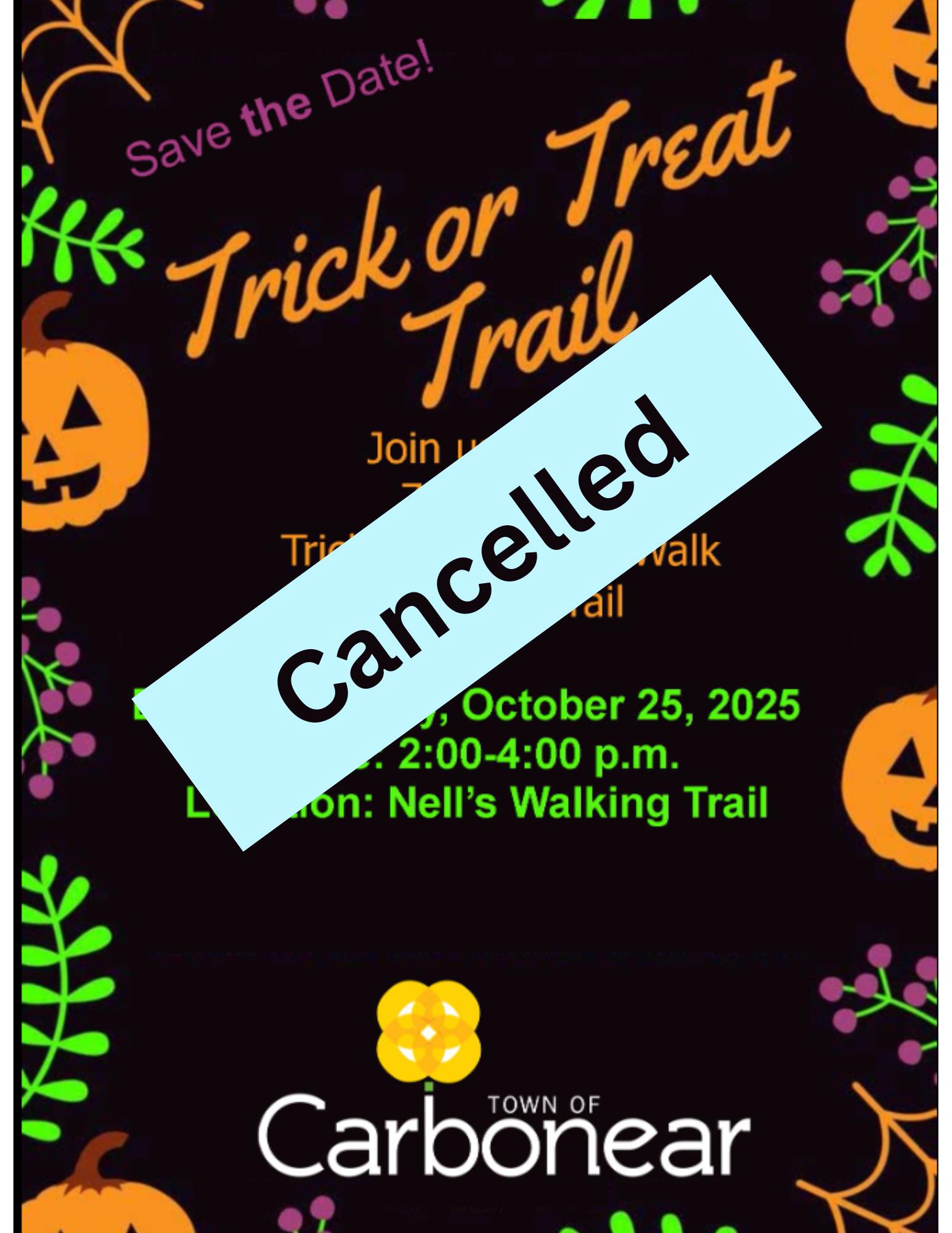 Due to the forecasted rain and the uncertainty of the trail conditions, unfortunately the Trick or Treat Trail on Saturday October 25th, 2025 from 2:00pm-4:00pm will be CANCELLED.