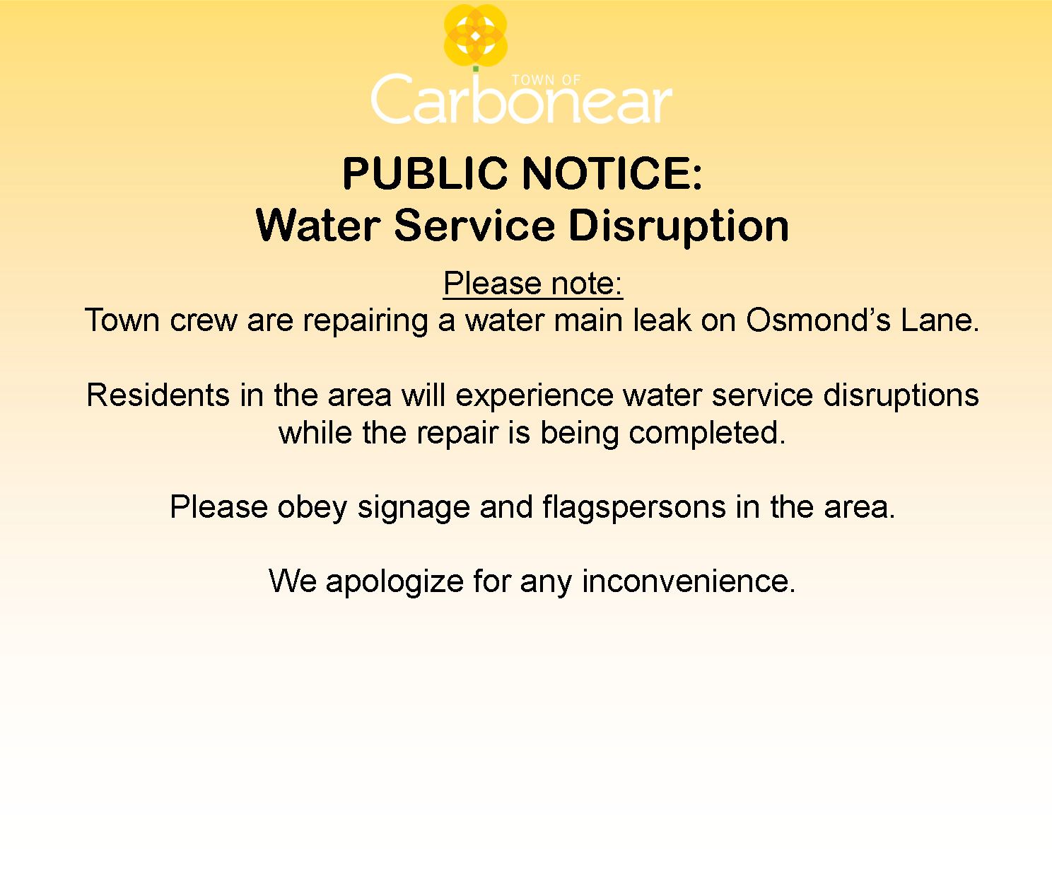 NOTICE: Water Service Disruption affecting residents on Osmond’s Lane