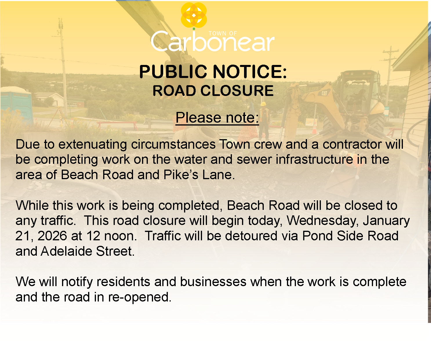 The Contractor working on the Beach Road Sewer Main Upgrade Project will be completing work which will require the road closure.