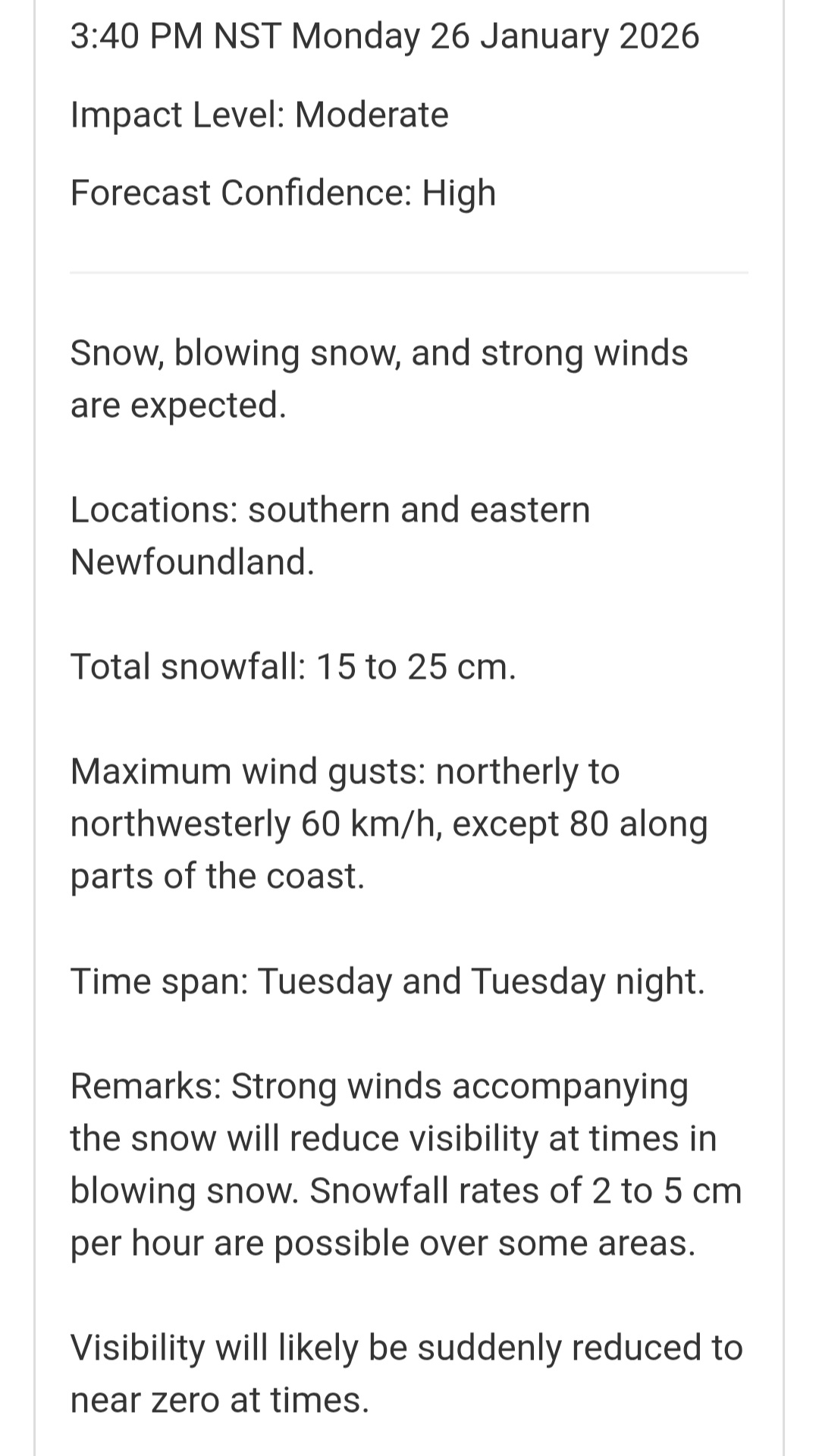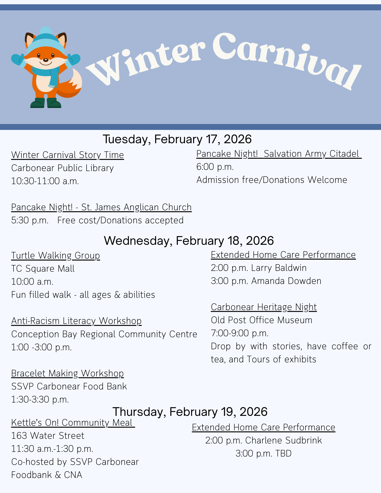 | December 1 – 5 | Southside of Carbonear including Powell Dr. to Saddle Hill; Pondside Road; London Road including connecting streets and Forest Rd. |
