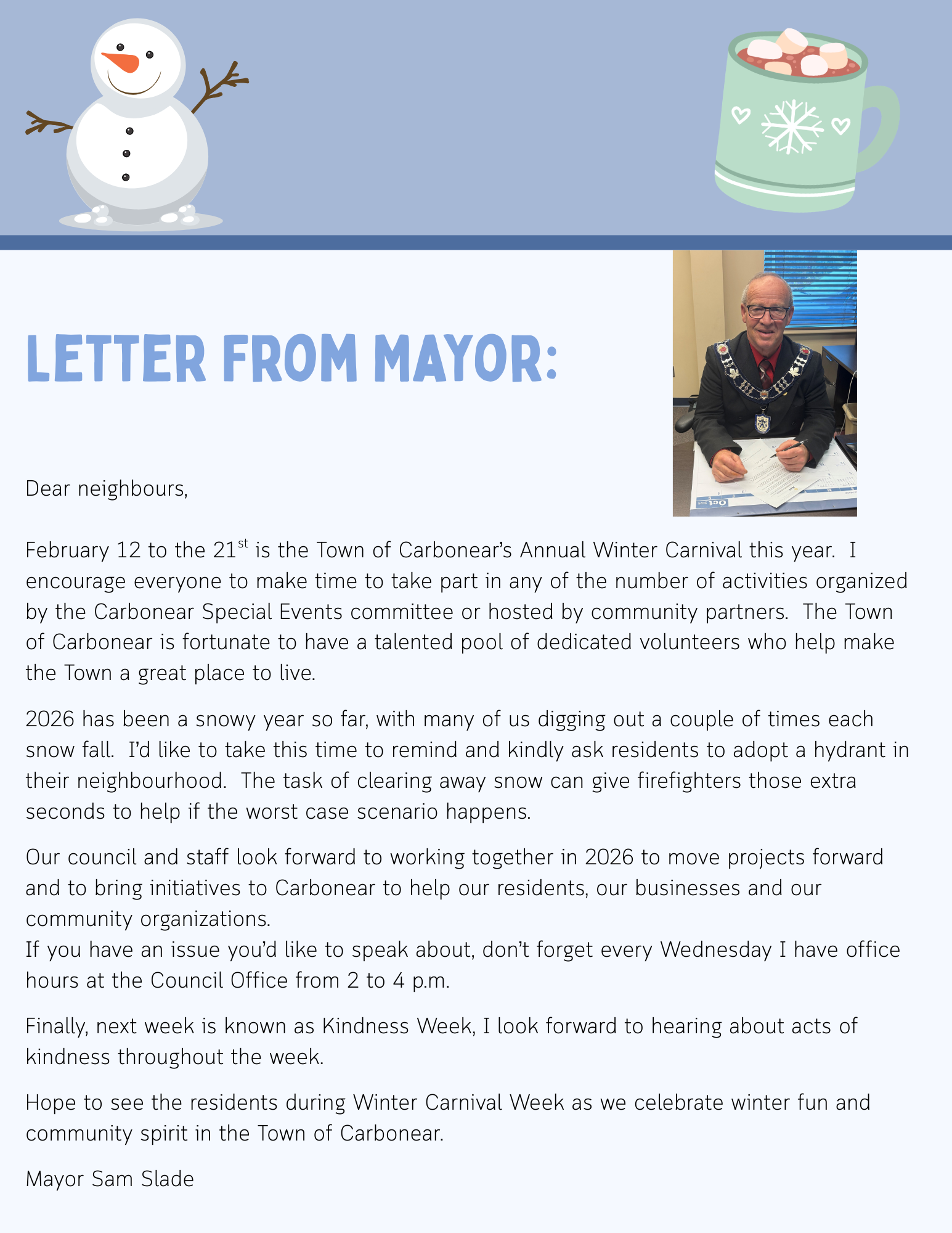 Mayor Slade would like to advise residents that starting today, Wednesday, October 29, 2025, he will be hosting weekly Wednesday hours.