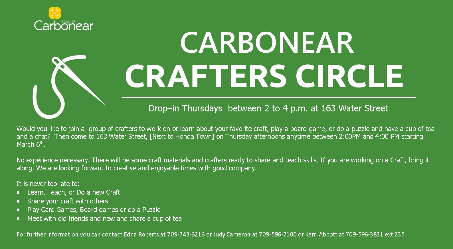 Carbonear Crafters Circle 2-4 p.m. at 163 Water Street