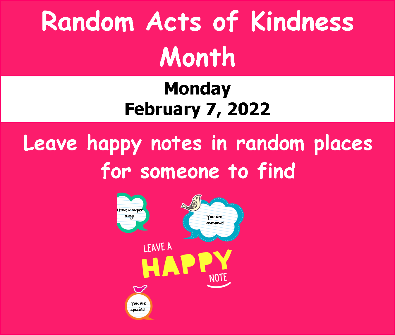 February 7, 2022 Random Acts of Kindness suggestion: Leave a happy note in random place for someone to find