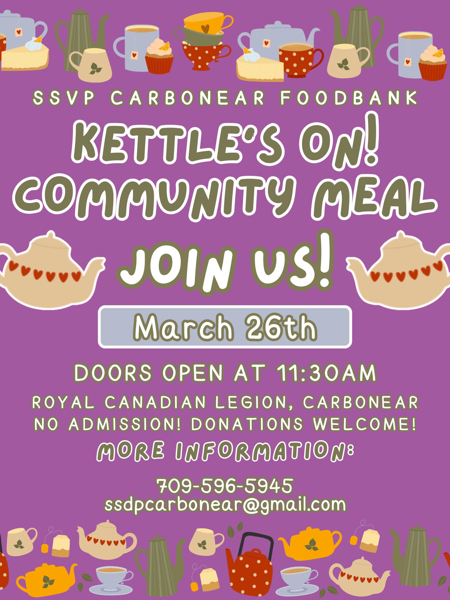 Kettle’s On: Community Meal will be on Wednesday, March 26th, 2025 at the Legion Carbonear!