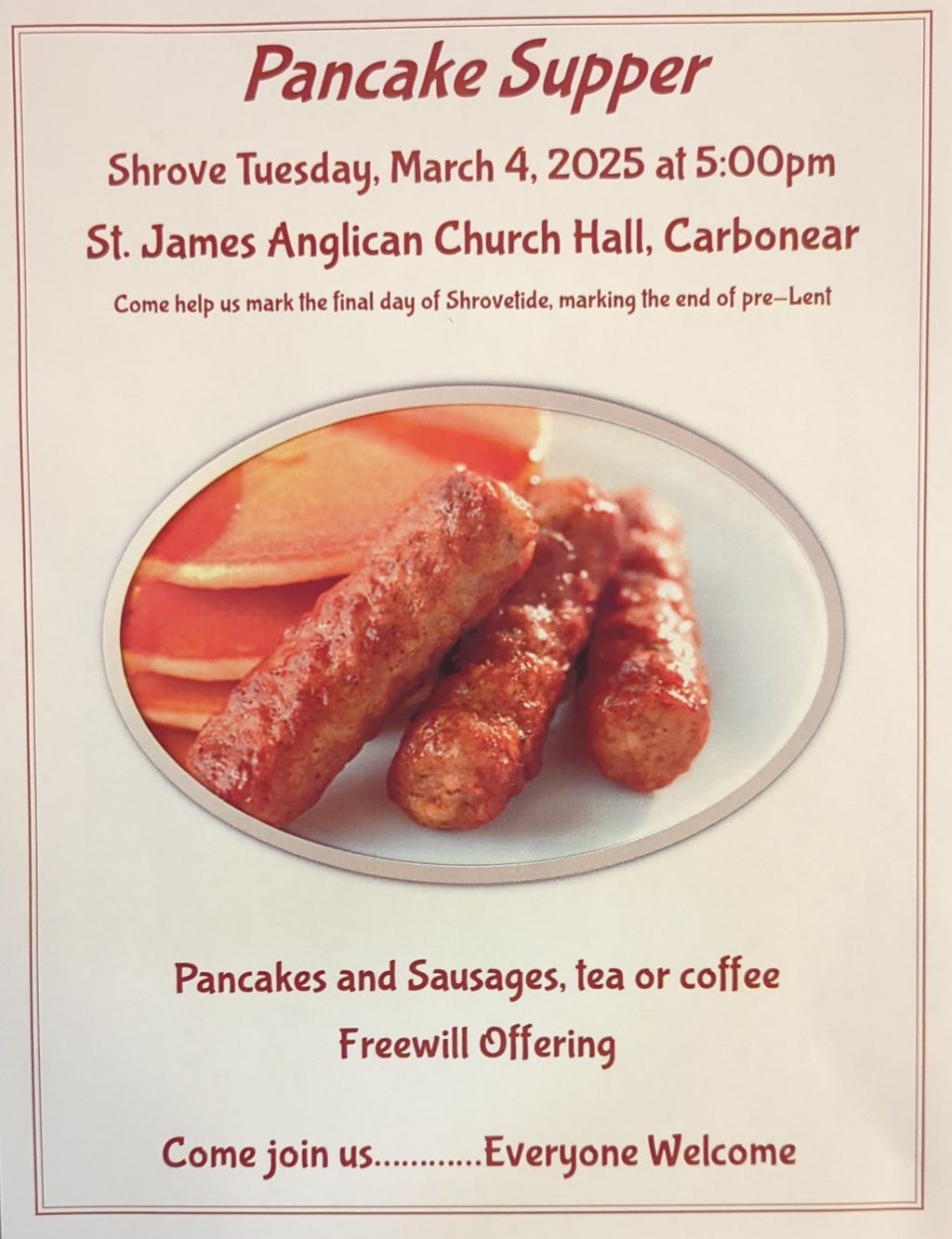 Pancake Supper at St. James Anglican Church Hall Tuesday, March 4, 2025 at 5:00 p.m.