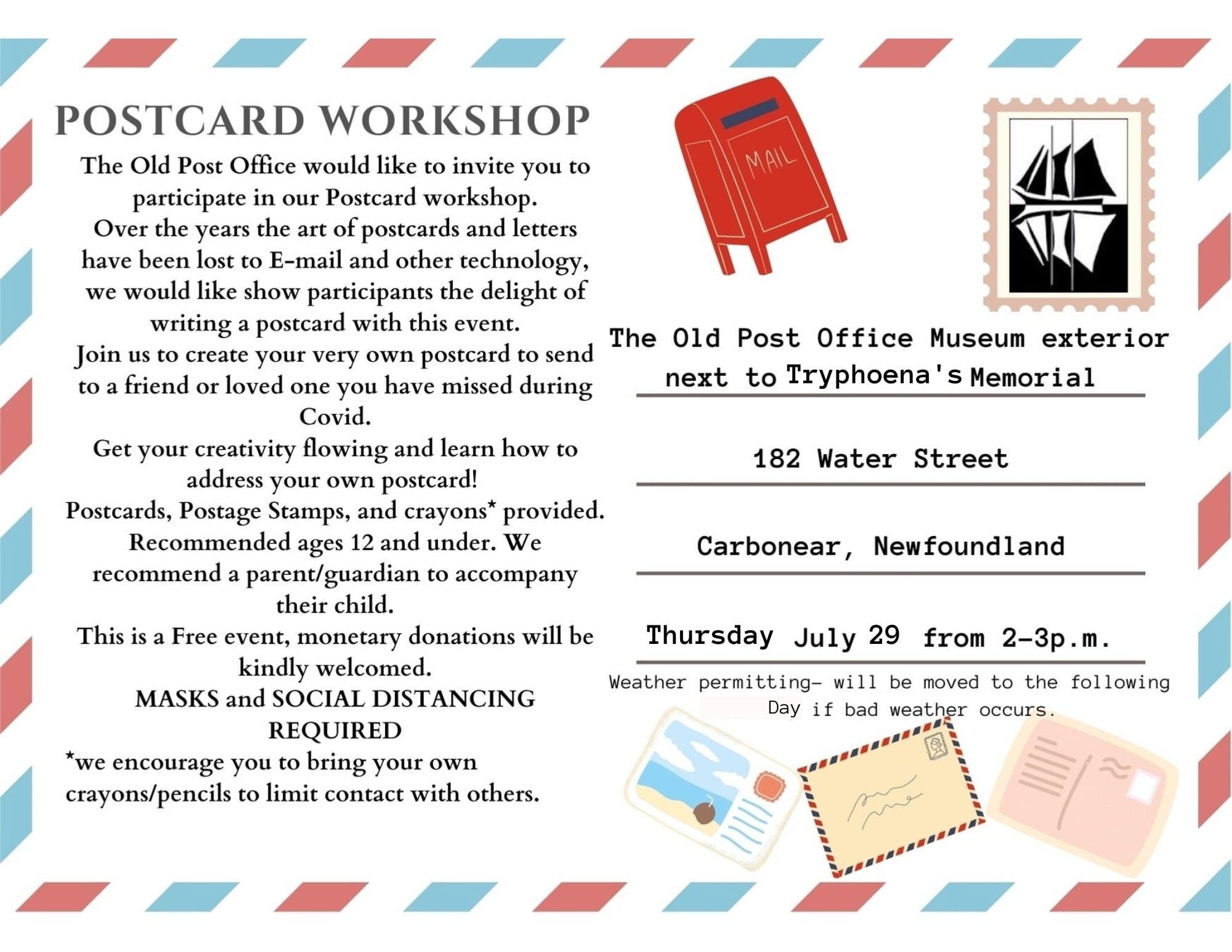 Postcard Workshop hosted by the Carbonear Heritage Society at The Old Post Office Museum exterior next to Tryphoena’s Memorial