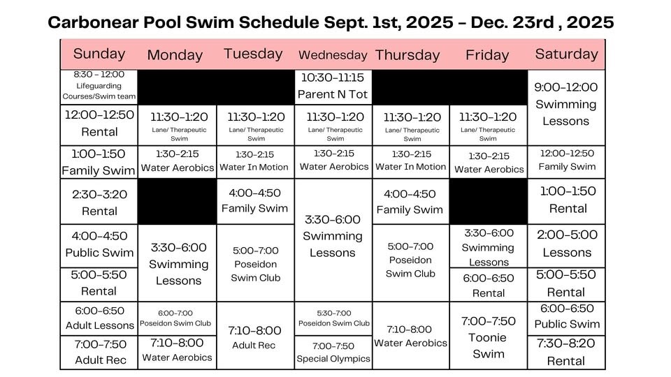 Carbonear Pool Swim Schedule September 1, 2025 to December 23, 2025 can be found here: